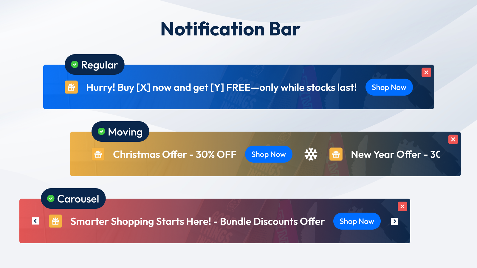 - Announcement Bars: Display important announcements, promotions, or free shipping across your store.