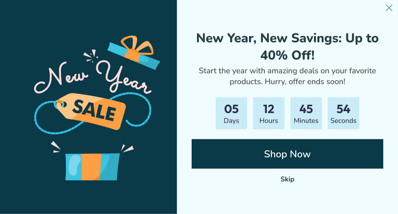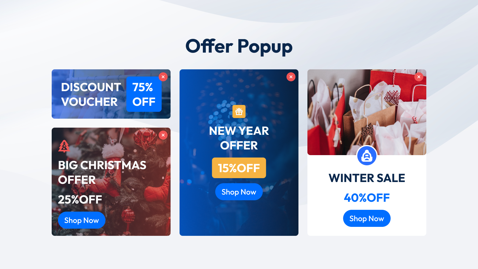 - Offer Popups: Promote special deals, discounts, and new arrivals to drive targeted sales.